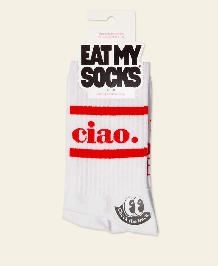 Des chaussettes « Ciao » qui claquent comme une réplique italienne pleine d’attitude. Fun, graphiques et faciles à porter, elles ajoutent une touche méditerranéenne et impertinente à ton style. Un petit mot pour dire beaucoup, directement à tes pieds.