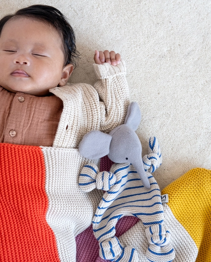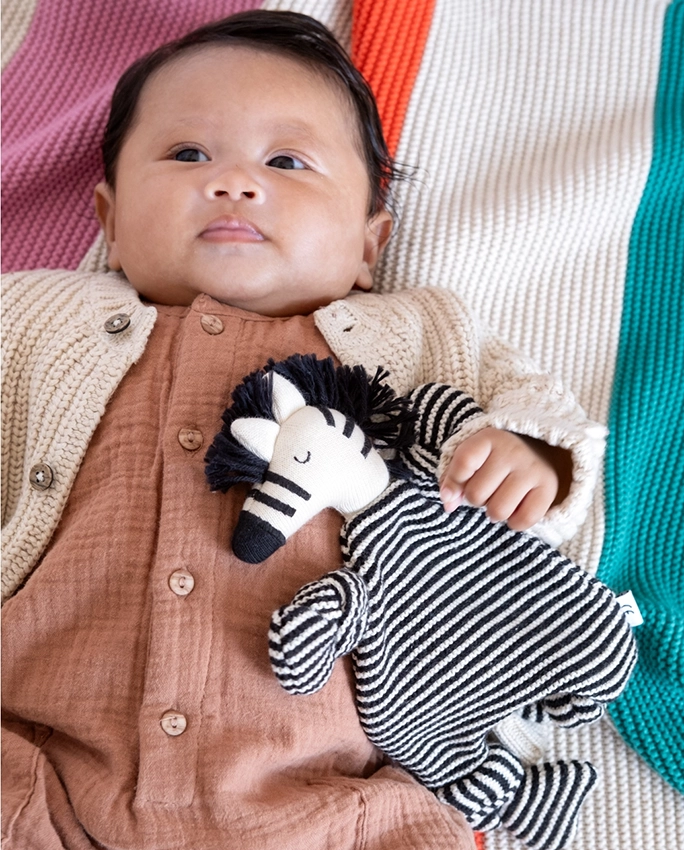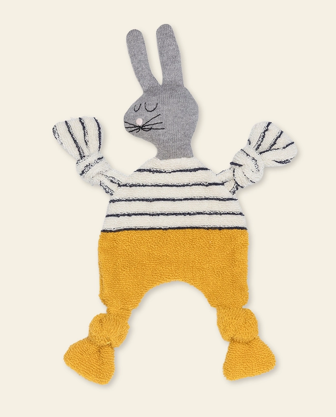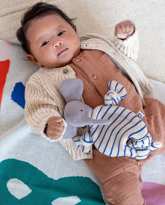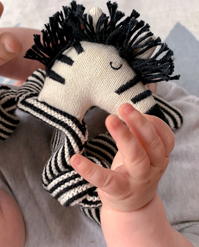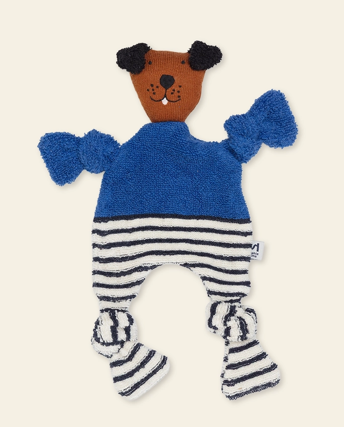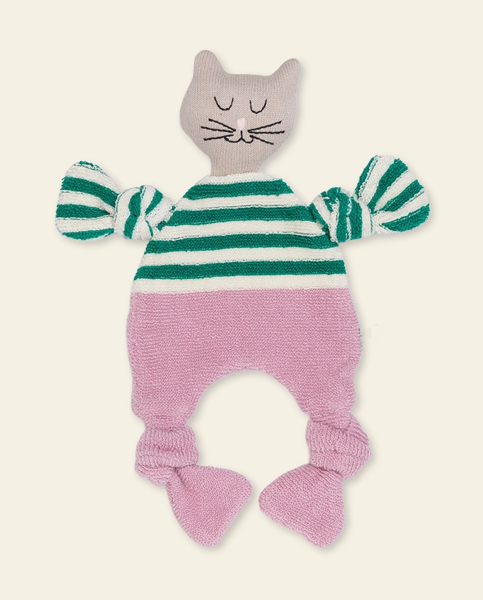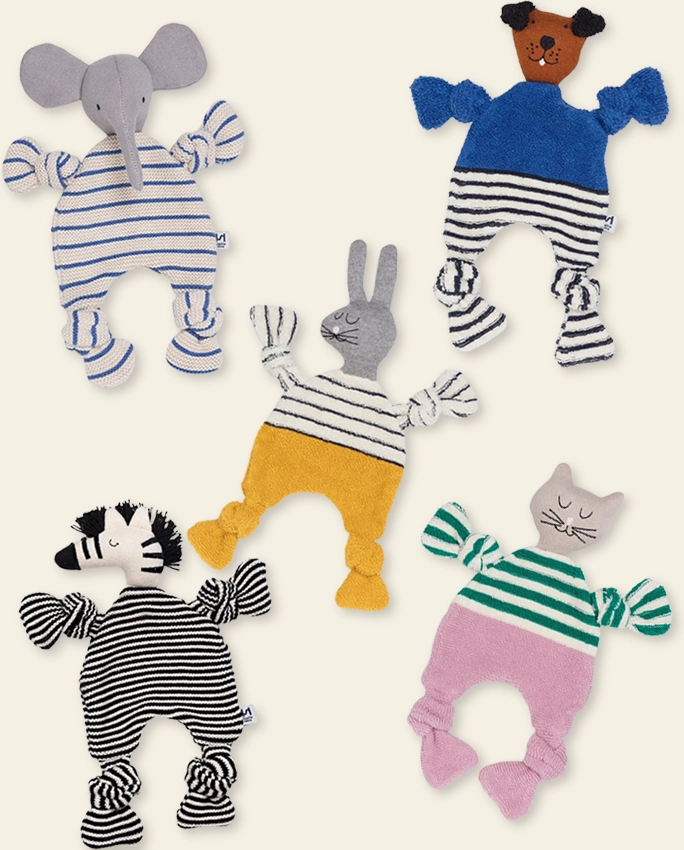 100% coton tricoté avec rembourrage en polyester recyclé dans la tête.