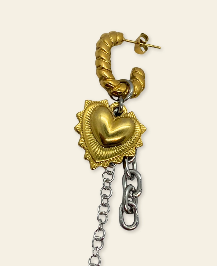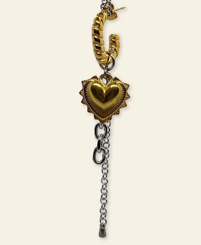 Une mono boucle qui ose les contrastes : ex voto doré sur chaîne argentée, créole en acier doré, pour un mélange de couleurs et de textures qui attire le regard. Engel*1 se porte seule pour un style minimaliste, en paire pour un équilibre subtil, ou en set avec d’autres mono boucles pour un effet encore plus audacieux et rock. Une pièce qui affirme ton style tout en jouant avec les codes du bijou rétro et contemporain.