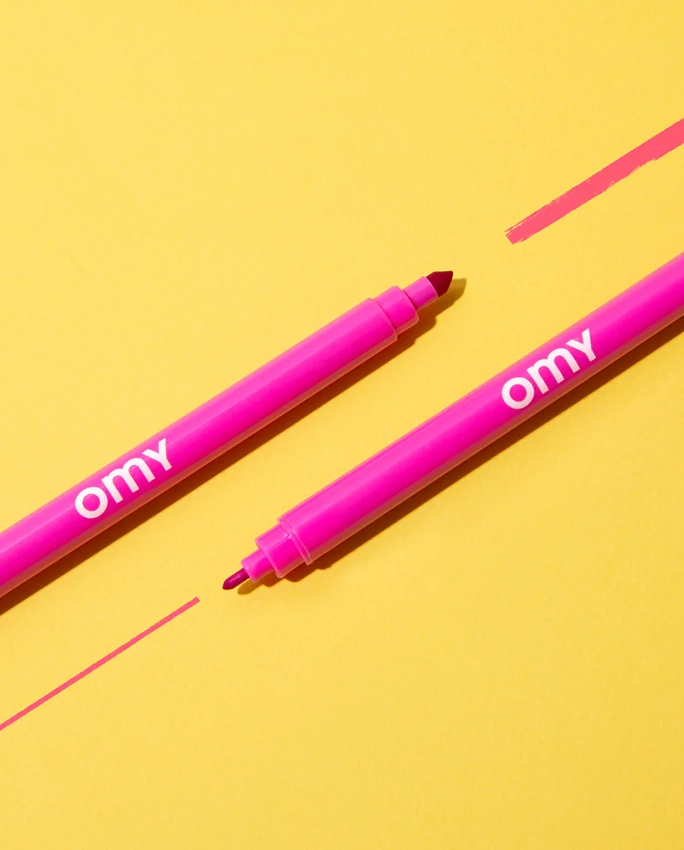 9 feutres double pointe : 1 fine, 1 large. Pratique, la boîte se transforme en pot à crayons à la maison !