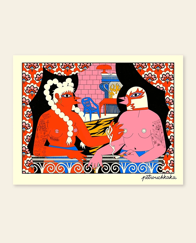 Petrouchkaka est une illustratrice française dont le travail donne des prénoms à ses images autant qu’il convoque des figures — mythologiques, culturelles ou du quotidien. Gaby est une de ces pièces à titre simple, qui laisse l’image parler sans explication. Le prénom suffit à poser une présence, une personnalité, une scène.