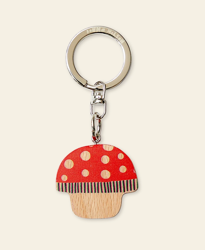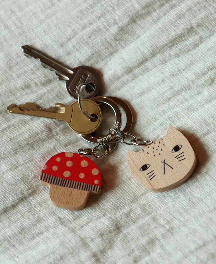 Porte-clés léger en bois FSC, imprimé des deux côtés et monté sur un anneau en métal solide.