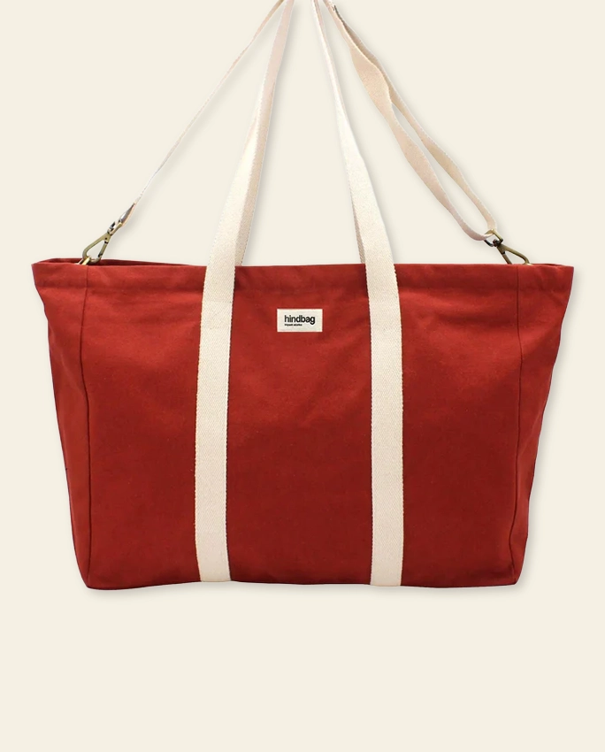 Le cabas Hindbag coton bio Jean est le grand sac du quotidien qui passe partout — courses, boulot, week-end, bagage cabine. 36 litres en coton biologique certifié GOTS, traitement déperlant, doublure blockprint. Solide, pratique, et franchement bien fait.
