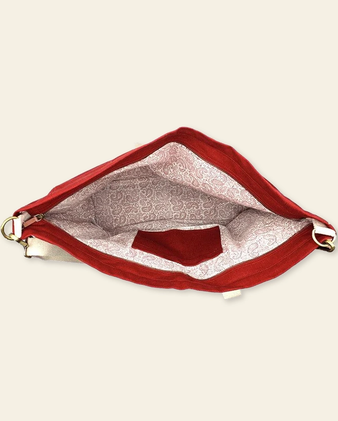 Le Jean est le sac qu’on attrape sans réfléchir. Assez grand pour une journée chargée, assez plat pour passer en bagage cabine. La bandoulière ajustable permet de le porter à l’épaule ou en travers selon la longueur. La fermeture éclair sécurise le contenu — détail appréciable dans les transports. La doublure blockprint ajoute un truc soigné à l’intérieur.