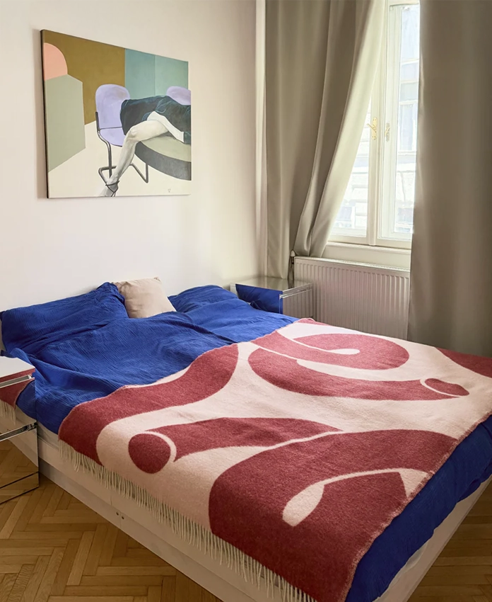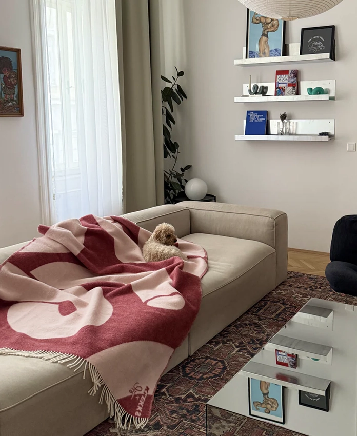 Organic swirl, mais en version cosy. Cette couverture reprend l’art emblématique de la créatrice autrichienne Ju Schnee, connue pour ses tourbillons organiques que l’on retrouve habituellement sur des toiles, des objets design ou dans des galeries à Berlin, Paris ou Los Angeles. Ici, l’œuvre devient textile: une pièce d’intérieur statement, généreuse et ultra chaleureuse, dans sa palette signature bordeaux et pêche. Une vraie pièce de collection, pensée pour durer, et qui pose instantanément une ambiance arty dans le salon ou la chambre.