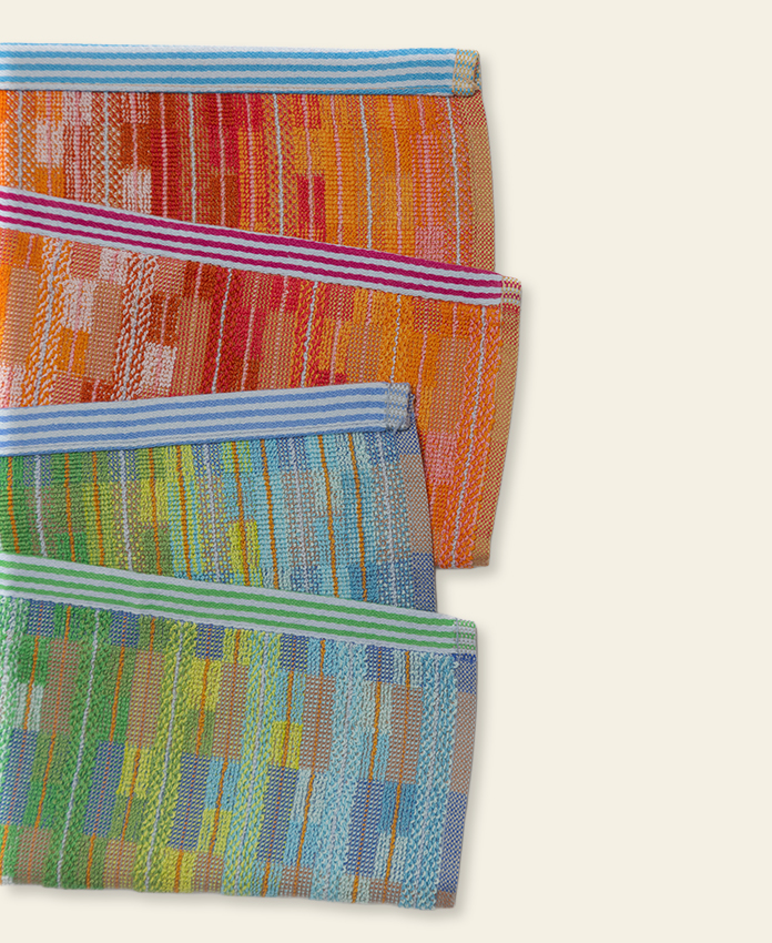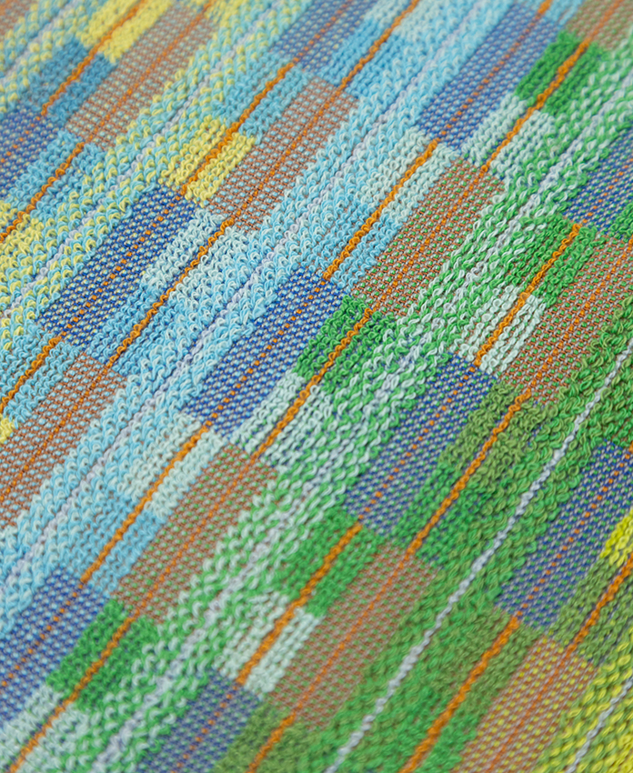 Le motif Basket #110 joue sur les fils tissés en jacquard, caractéristique du savoir-faire Foekje Fleur. Par ailleurs, la fabrication au Portugal garantit une qualité textile rigoureuse. La combinaison de couleurs reçue dépend des surplus disponibles au moment de la production — certaines couleurs peuvent être plus présentes que d’autres dans le duo. C’est d’ailleurs ce qui en fait un objet vivant, jamais tout à fait identique d’une commande à l’autre.