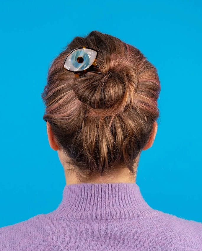 Le pic à cheveux Oeil acétate Coucou Suzette est une épingle à chignon en acétate de cellulose, surmontée d’un œil bleu turquoise. En effet, c’est le tout premier pic à cheveux de la marque — et il a tout de suite placé la barre assez haut. Ses deux dents ondulées façon écaille de tortue s’enfoncent dans le chignon et maintiennent en place même les coiffures faites à la va-vite. Ainsi, en quelques secondes, les cheveux sont relevés, tenus, et l’ensemble a l’air intentionnel. Le genre d’accessoire qu’on glisse dans son sac et qu’on oublie jusqu’au moment où on en a besoin.