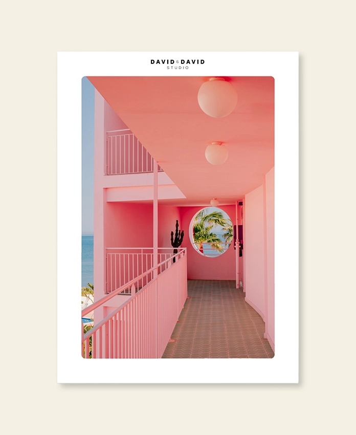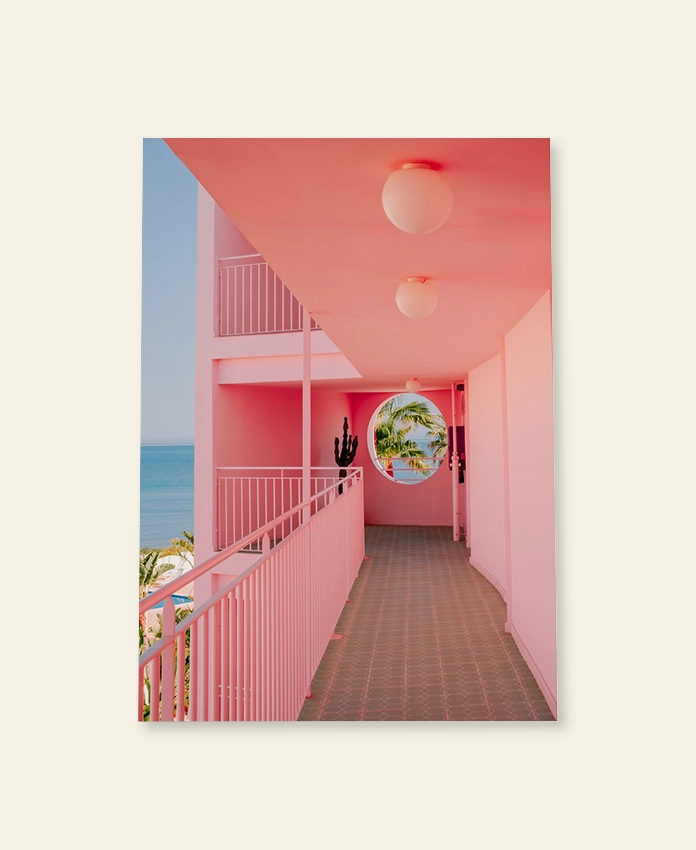 Thao Courtial a photographié les couloirs roses acidulés d’un hôtel iconique d’Ibiza avec une précision qui transporte immédiatement. C’est donc une affiche photo Fine Art qui installe une ambiance – rétro-chic, solaire, légèrement glamour. En effet, les teintes oscillent entre le disco et la dolce vita, avec cette lumière douce et chaude qu’on ne trouve qu’à Ibiza. De plus, le cadrage sobre laisse toute la place à la couleur et à l’atmosphère. affiche photo Fine Art Ibiza