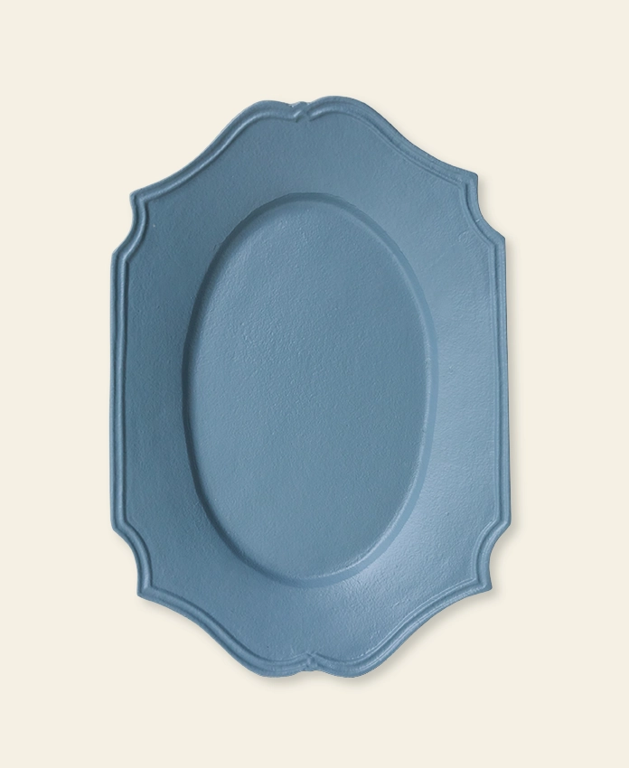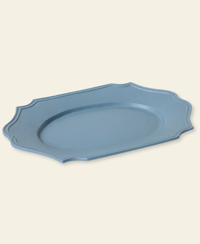 Ce plateau de service en aluminium HK Living New Classics joue la carte de la simplicité assumée. En effet, la finition mate soft blue donne l’impression d’une surface peinte à la bombe — propre, uniforme, sans fioriture. Ainsi, la forme classique du plateau de service se retrouve dans un coloris contemporain qui tranche avec les plateaux en bois ou en osier habituels. De plus, l’aluminium lui confère une légèreté relative malgré ses 815 g et son format 35,5 cm : il reste facile à manipuler à une main.